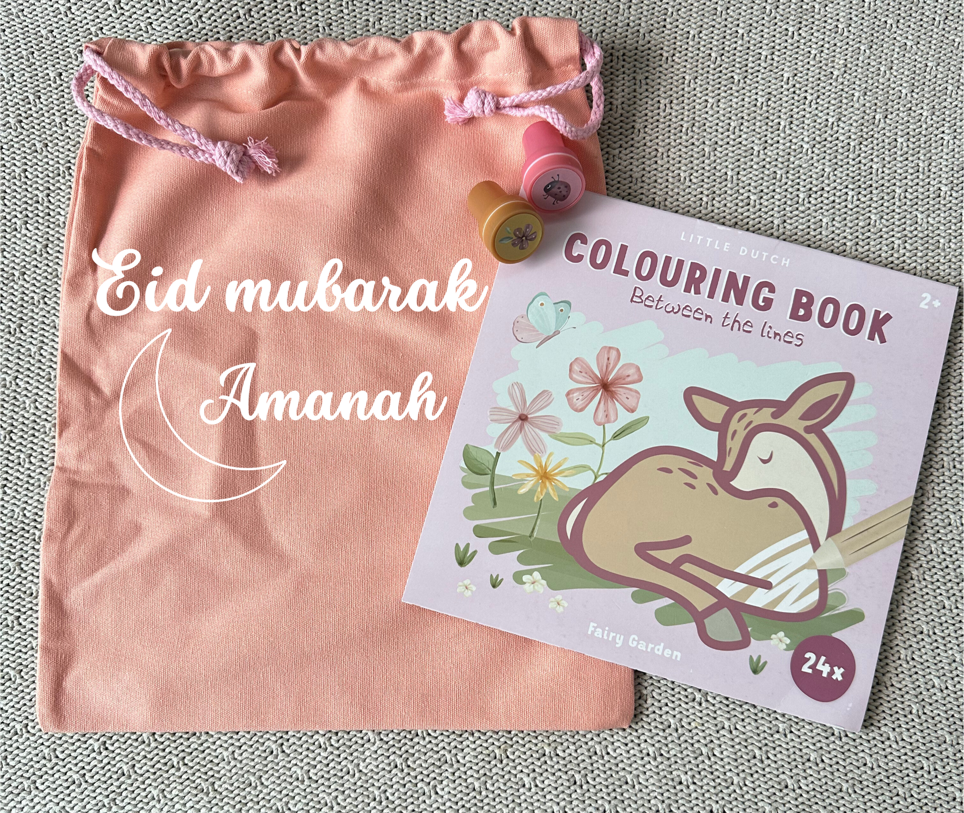 Deze cadeautasje is gelijk klaar om weg te geven. Bedrukt met Eid Mubarak en naam van het kindje. Er zit een leuke Little Dutch kleurboek bij met 2 stempels.
